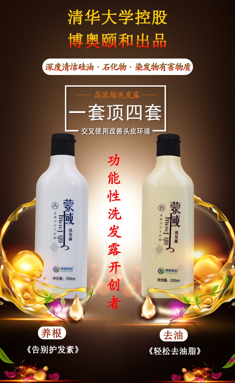 蒙域防脱洗发水是国内唯一一款由清华控股“博奥颐和”为中国消费者量身打造的、富含多种中草药精华的、黑科技健康洗护用品!它颠覆了世面上洗发产品的单项功能!在具有防脱,去屑,防白,消炎等基本作用的基础上,关键在于调整因使用化学产品损伤的头皮环境,从而实现排出体内重金属毒素的作用。AB两瓶交替使用可调节头皮为健康状态(PH5.5--6.2)。适用于所有人群使用。
